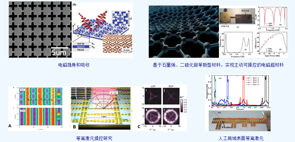 超材料和超表面的发现和飞速进展为天线和微波器件的设计带来了新的机遇。自2000年开始,人们发现可设计具有特定结构的电磁超材料(Metamaterials)来有效调控电磁波的行为,这引发了国际上的一波研究热潮。所谓超材料是指将亚波长人工微结构(人工原子)按照特定宏观排列方式组合而成的人工复合介质。通过人工微结构的设计,可实现自然界中不存在的负折射、超聚焦、电磁隐身等特性。研究内容包括:电磁隐身和吸收、等离激元(近场光学)调控、主动可控超材料、电磁波极化调控。