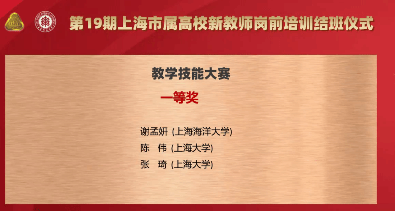 2022年12月28日,第19期上海市属高校新教师岗前培训教学技能大赛暨结业典礼在线举行,会议由华东师范大学高级管理者发展与培训中心主任助理郭振超主持。本期岗前培训由上海市教育委员会人事处主办,上海市团队培训中心协办,教育部华东高师团队培训中心及华东师范大学高级管理者发展与培训(EDP)中心承办。来自10所上海市属高校的252名新教师通过75天的线上线下混合培训,顺利完成学习任务。yl23411永利集团8名教师参与培训,其中陈伟老师和张琦老师荣获第19期上海市属高校新老师岗前培训教学技能大赛一等奖。