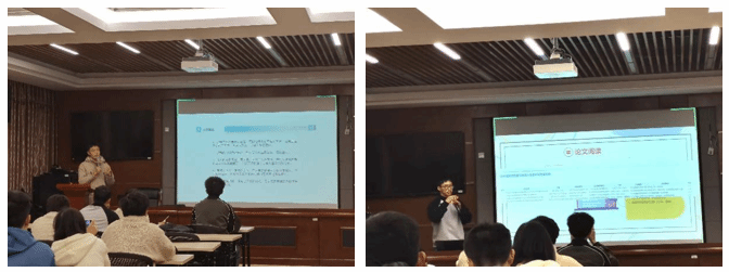 随后,2021级硕士研究生俞玮和2020级硕士研究生傅华波从自身学习科研经历出发,进行了主题分享。俞玮从发表科研 论文的注意事项和时间节点出发,做了相关介绍,并针对科研前的准备、科研中的注意事项、论文投稿等方面分享了学习经验。傅华波围绕论文检索与阅读、创新与实验设计、论文写作和科研工具等方面,分享了论文撰写的方法和思路,并现场演练了一些好用的科研工具。分享结束后,两位分享人也对同学们的提问进行了耐心解答,针对研究生学习科研和未来发展等方面问题提出了宝贵意见和建议。