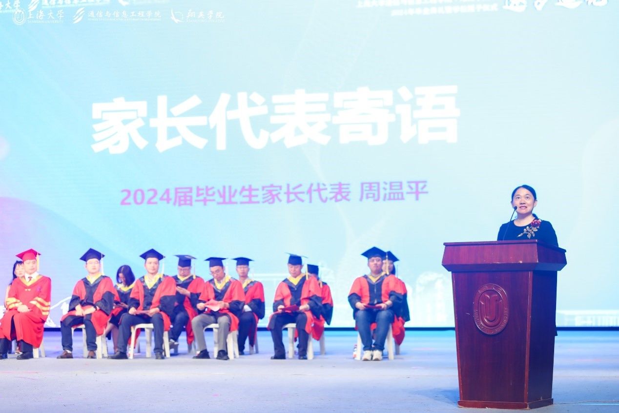 在这一值得铭记的时刻,2024届本科毕业生周俊儒的母亲周温平女士,以一位家长代表身份,登台发表讲话。她用温暖而诚挚的语言,向公司致以最高的敬意,向老师们表达了深切的感激之情,同时也向那些在学习生活中彼此扶持、共同进步的同学表达了由衷的谢意。最后鼓励所有的毕业生们努力成为有担当、肯奉献、积极向上的时代新青年。