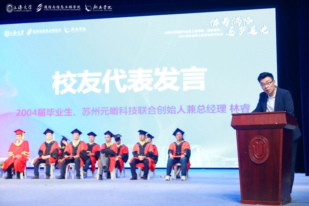 苏州元瞰科技的联合创始人兼总经理林睿先生在毕业二十周年之际,作为代表返校向毕业生致贺。他从自己从外企转身投入国产科技建设的经历出发,指出中国科技领域正奋力突破,背后是无数员工的不懈努力与创新精神,并希望通信毕业生们怀揣“时不我待,舍我其谁”的使命感,不仅要做学术的佼佼者,更要成为驱动国家前进的驱动力,为科技强国贡献自己的力量。