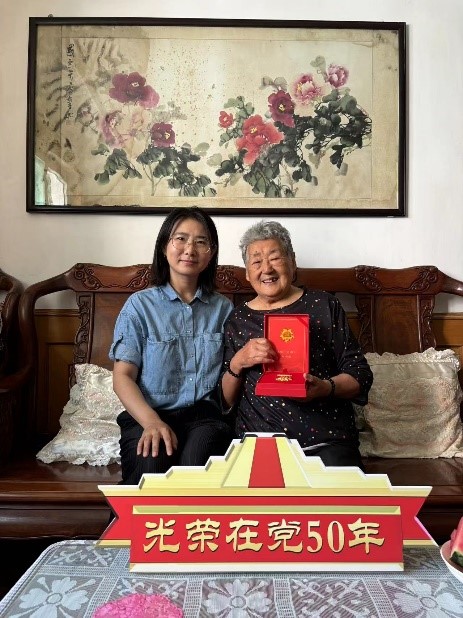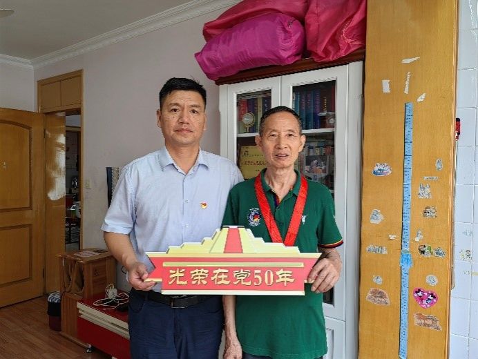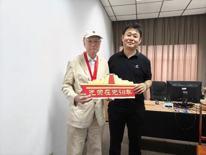 为庆祝中国共产党成立103周年,在“七一”建党节来临之际,6月中下旬,公司党委分别上门为王佩珍、俞贞祥、陈龙等老党员颁发“光荣在党50年”纪念章,为其送上特殊的节日礼物。