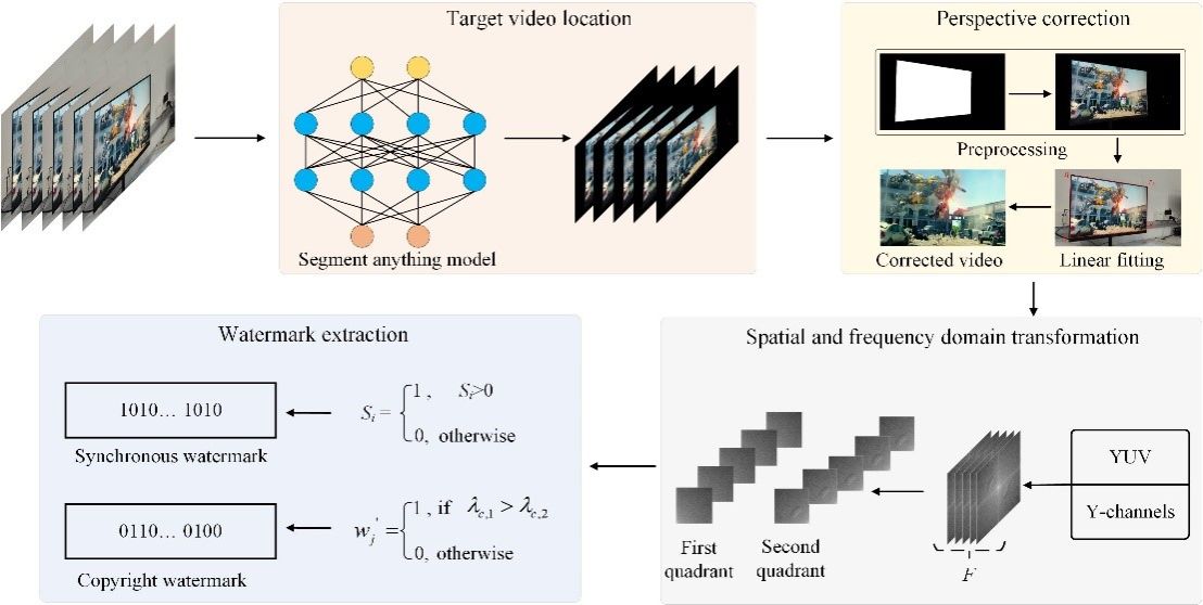 本文基于分割模型和视频的频域信息,提出了一种全自动抵抗摄像机录制的鲁棒盲视频水印方案,在保证水印鲁棒性和不可感知性的前提下,使得在录制场景下水印提取工作更加自动化。在水印嵌入阶段,通过在每组版权水印的首处各嵌入一组同步水印,从而可以有效地抵抗时域攻击,避免了人工手动对齐视频。在水印提取阶段,基于图像分割模对录制得到的视频进行全分割,并利用视频特征来识别出目标区域,再结合每一帧的目标区域自动捕获到视频内容的四个角点坐标,从而实现了对失真视频的自动透视矫正。实验结果表明,该工作与现有视频水印方案相比,在抵抗几何攻击和摄像机录制方面具有更高的鲁棒性,并且在水印提取阶段更加自动化,不需要人工对齐视频和矫正视频。此工作为针对摄像机录制场景的视频水印提供了一种新的自动提取水印方案,将有助于在水印提取阶段减少人工辅助,使得视频水印的应用场景更加广泛。