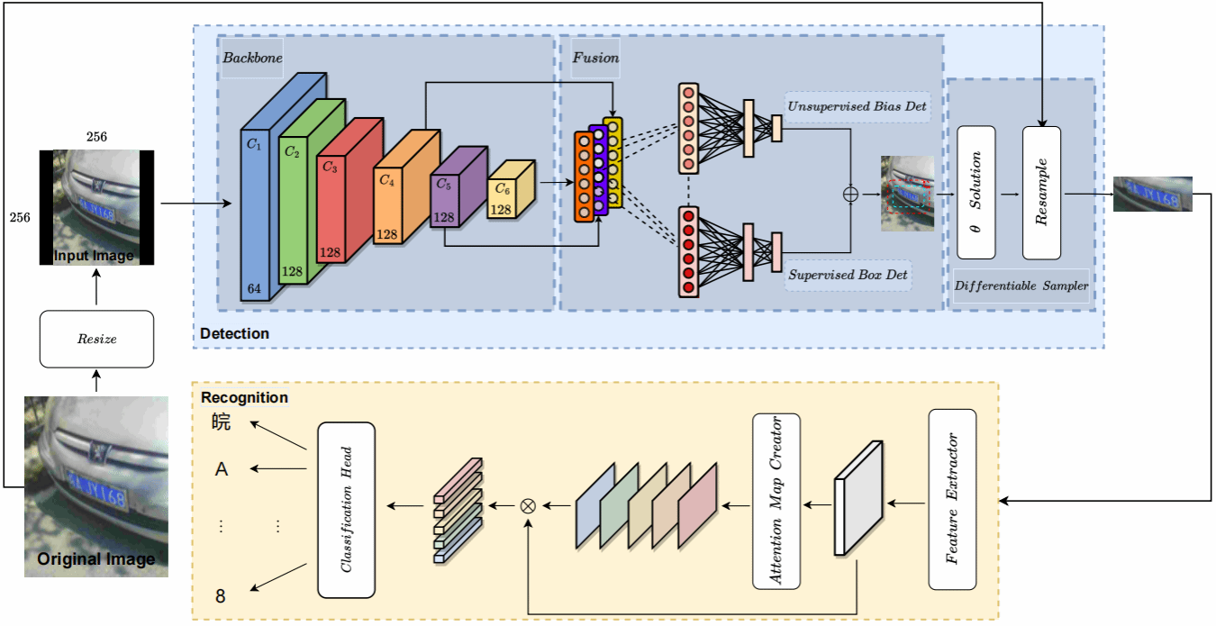 该文提出了一种基于可微采样模块的新级联架构,以满足端到端技术中车牌检测器和识别器的不同图像分辨率要求。基于该模块,网络可以在下采样的低分辨率图像上检测车牌,并从原始高清图像中重新采样以识别车牌号。此外,由于检测器对检测框的优化方向和识别器的输入要求不一致,引入了偏置检测头,以解耦检测器和识别器的边界框需求。同时,提出了一种新颖的特征融合模块,该模块同时满足多尺度信息的融合和两个包围框特征的交互。对于识别器,引入了一种基于解耦注意力机制的统一架构,用于识别单线和双线、不同长度以及倾斜车牌。