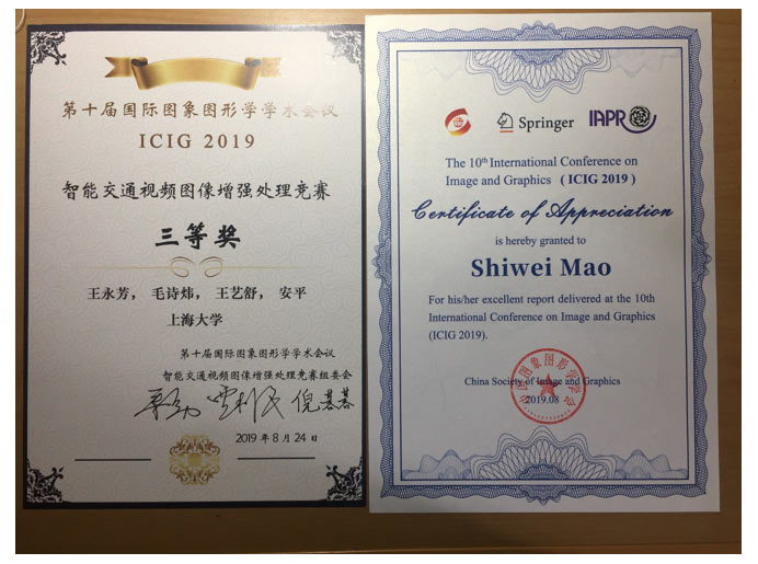 国际图像图形学学术会议(ICIG)是国内外图像图形学领域几大最高级别的系列国际会议之一,ICIG2019于2019年8月23-25日在北京圆满召开,会议主题为人工智能时代的图像图形前沿研究。本届ICIG设置了智能交通视频图像增强处理竞赛,其中一等奖1项,二等奖1项,三等奖3项,来自多所高校和科研院所的31支队伍,100余名研究生参赛。yl23411永利集团yl23411永利集团的“An End-to-End Signal Image Haze Removal based on Attentive GAN”项目获得了该竞赛的三等奖,该项目是在王永芳老师的指导下由两位yl23411永利集团本科生毛诗炜和王艺舒完成。特别需要指出的是,在本次获奖中毛诗炜和王艺舒是唯一的本科生,这也证明公司本科生的科研能力很强。