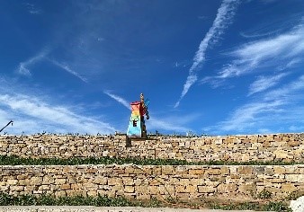 色彩斑斓的风车与广阔蓝天相得益彰,呈现出宁静与童年记忆的融合。石砌的台阶与绿意盎然的植物,为这片场景增添了自然的气息,传递着家乡的温情。新年的临近唤起对故乡的思念,风车成为连接过去与现在的象征,表达了归属感与温暖的情感。