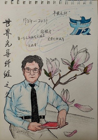 作品以温情的笔触展现黄宏嘉院士的画像,充满敬意与缅怀。画面中的黄宏嘉院士,身着整洁的蓝色衬衫与黑色领带,眼镜后的眼神透露出深邃与智慧,他仿佛正沉浸在光纤世界的奥秘之中。手中那本红色封面的书,或许正是他智慧的源泉,记录着他对光纤研究的无尽探索。背景中的粉色玉兰与散落的花瓣,为这幅画增添了一抹温馨与柔美,仿佛在诉说着这位科学家在严谨的科学研究中,也不失对生活的热爱与向往。