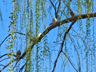 在亮蓝色的天空下,几只飞鸟于树枝上歇脚,好奇地盯着下方各式各样的愉快的行人,让人感觉分外可爱。
