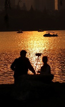 落日余晖铺满湖面,波光粼粼。湖畔边,两人于静谧中相对,似在轻声私语。周围的一切都被镀上了金色,他们在这大自然馈赠的美景里,享受着独属于彼此的宁静与温馨。
