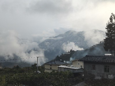 回到老家后,跟随长辈走入了深山之中。早晨时分远处的山脉被云雾缭绕,山顶覆盖着白雪,给人一种神秘而壮丽的感觉。山脚下,几座传统的乡村房屋错落有致地分布在山坡上,屋顶的瓦片和墙壁的纹理清晰可见,透露出一种古朴的乡村气息,展现了一幅宁静而美丽的乡村景象。