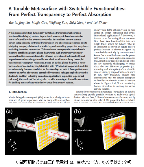 近日,yl23411永利集团yl23411永利集团肖诗逸课题组提出了一种新型电磁超构表面,可以根据不同需要在透明、屏蔽和全吸收模式之间进行自由切换。这项研究不仅在理论揭示了透射式动态超表面设计困难的理论根源,更为进一步设计先进多功能的天线罩开辟了新的道路。相关研究成果已于2020年1月15日以A tunable metasurface with switchable functionalities: from perfect transparency to perfect absorption为题发表于一区SCI期刊《Advanced Optical Materials》(影响因子:7.12)。