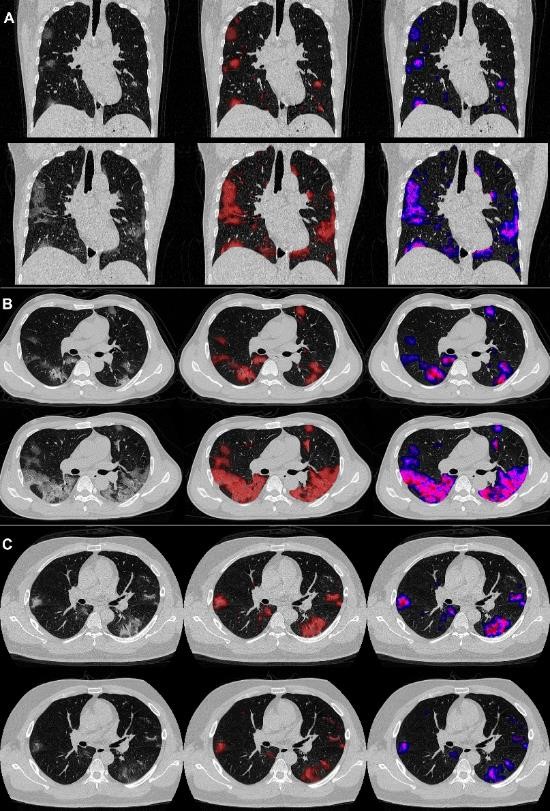 研究中,联合科研课题组针对上海市公共卫生临床中心确诊的134位COVID-19患者,使用全卷积神经网络AI算法自动计算肺炎病变的三个定量CT特征,包括磨玻璃病变体积占比(PGV),实性病变体积占比(PCV),以及磨玻璃-实性过渡密度区病变体积占比(PSV)。