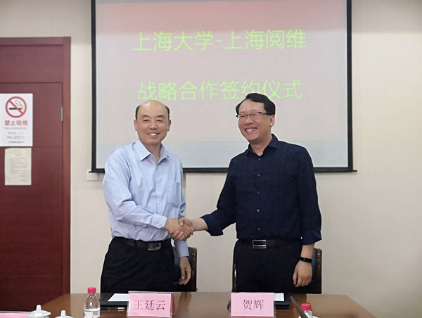 王廷云经理和贺辉董事长共同签署《共建“上大-阅维网络空间大数据联合实验室”合作协议》。