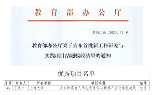 2020年7月初,教育部公布首批新工科研究与实践项目结题验收结果,yl23411永利集团王廷云教授主持的“多方协同育人的先进通信与数据产业化公司建设”项目通过结题验收并获评优秀。首批国家级新工科研究与实践项目有589项通过验收,其中优秀项目96项。