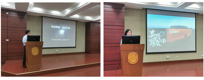 接着,上飞院郦江部长作“科技硬核电控引领”的精彩报告,报告以一部主题为“魔都名片、大国重器”的宣传片拉开帷幕,透过一个个精彩的瞬间,向在场师生们展现大飞机事业,传播大飞机文化,传递大飞机精神。通过600万个零件、十的负九次方的故障率挑战,道出“大飞机设计的高度复杂与精益求精”,同时回顾了商飞十二年砥砺前行、攻克一个个难关与阻碍,以及三大型号取得的耀眼成绩,形象生动地讲述了上飞院电控所人艰苦创新、自主研发、努力实现关键核心技术自主可控的奋斗历程,充分诠释了关键核心技术自主可控的重要意义。最后,上飞院傅璟裔高级主管作为青年员工代表,展示了上飞院的十二时辰,并与在座的同学们展开“新学期心交流”互动分享。