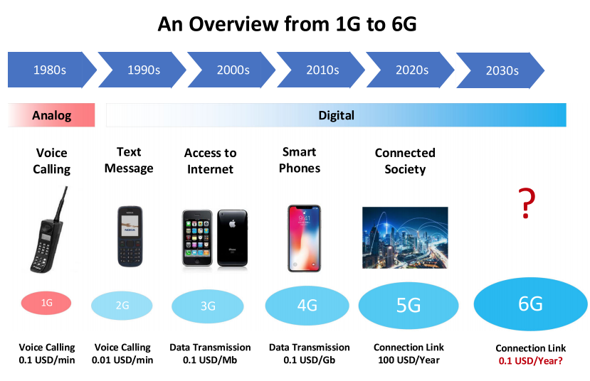 回顾移动通信网络的发展历史,不难发现偶数代往往比奇数代的更为成功。2G时代GSM的普及将语音通话从1G时代的0.1美元/分钟降低到0.01美元/分钟;而4G时代则将流量费用从3G时代的0.1美元/兆比特到0.1美元/吉比特。作为5G时代的起点,目前不管是光纤到户(FTTH)还是一部移动电话,用户所支付的价格均为100美元/年左右。6G时代,预计会有超过100万亿个传感器接入网络,如果移动市场的规模达到1万亿美元左右的话,那么对于每个连接而言价格仅为0.1美元/年,也就是千倍的成本降低。