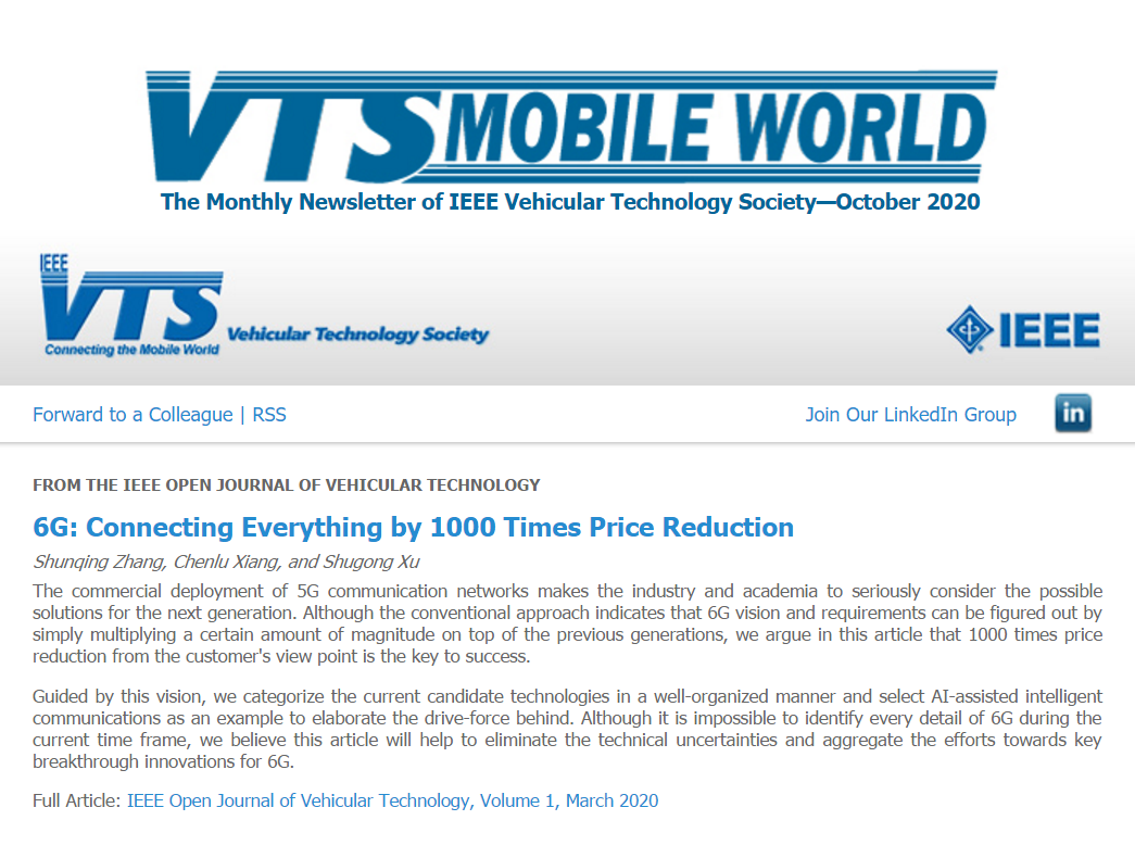 近期,IEEE VTS newsletter 在首页隆重推荐了yl23411永利集团yl23411永利集团GREAT团队张舜卿教授和徐树公教授合作发表的“6G: Connecting Everything by 1000 Times Price Reduction”(6G:构建成本降低千倍的智联世界)一文。文中对现有的潜在6G技术进行了梳理,指出为6G成功的关键是显著降低成本。该论文发表在IEEE新晋期刊IEEE OPEN JOURNAL OF VEHICULAR TECHNOLOGY上。
