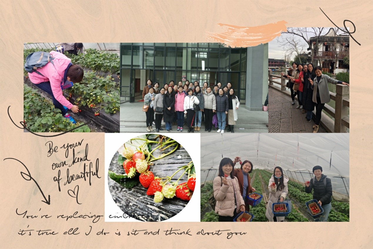 大家先来到了青浦天天草莓园,这时节的草莓自然成熟,奶香浓郁。收获满满之后老师们走上乡间小道,看看盛开的油菜花,认认菜田里的农作物,呼吸着清新的空气。有的还购买了新鲜的农副产品。之后的农家乐午餐,新鲜的蔬菜、鲜美的土鸡、软糯的土家东坡肉,为大家不停交流分享、热闹非凡的餐桌更增添了一份喜悦。