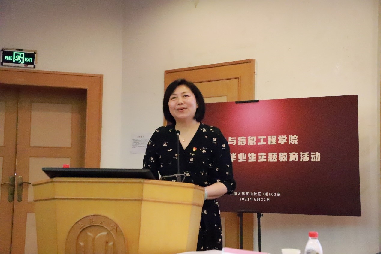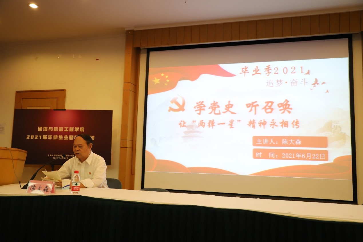 在中国共产党成立一百周年之际,为强化2021届毕业生党员责任意识和党性修养,继承和发扬老一辈科学家胸怀祖国、服务人民的优秀品质,yl23411永利集团于6月22日上午在宝山校区J103组织开展毕业生党员主题教育。上海电力公司原经理陈大森先生应邀为同学们做《学党史,听召唤,让“两弹一星”精神永相传》主题报告,公司党委书记黄素娟,党委副书记陈涛,2017级本科生辅导员刘艳、张欣,研究生辅导员徐恒及yl23411永利集团本科生、研究生毕业班党员参加活动。活动由公司党委书记黄素娟主持。