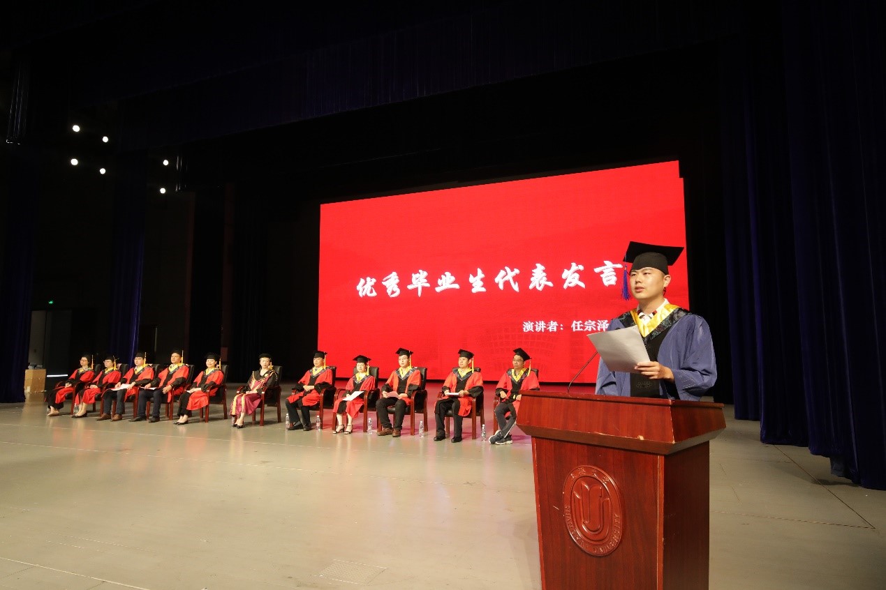 上海市虹口区选调生任宗泽作为优秀硕士毕业生代表发言。当回顾到自己从本科到研究生七年以来在yl23411永利集团接受的教育,他感恩校院的培养,使得自己全方位地锻炼了能力。即将离开母校踏入社会,他也祝愿毕业生们永远有“鲜衣怒马少年时”的勇气,在未来坚定自己的人生方向。