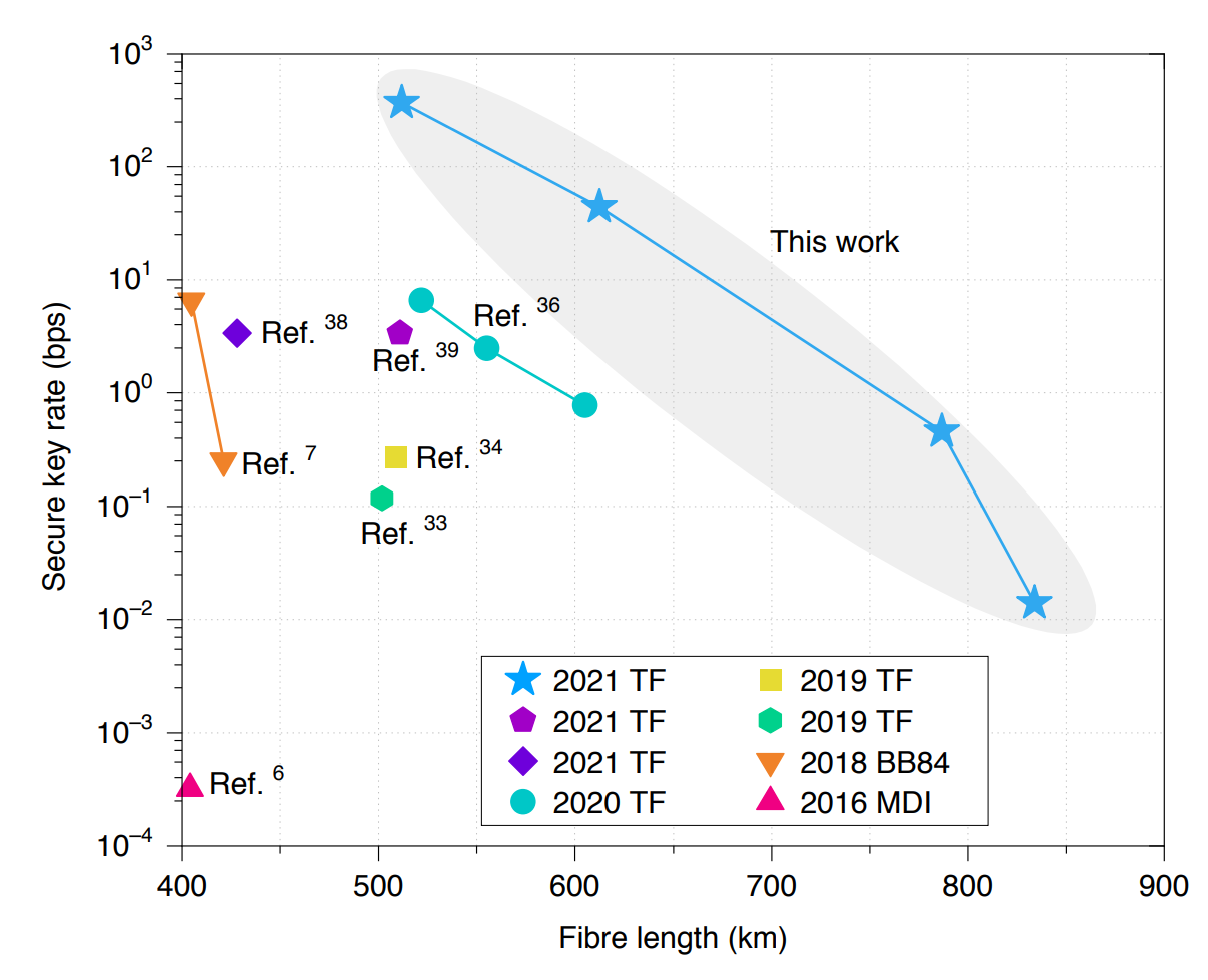 Fig.1 Summary of recent long-distance QKD experiments beyond 400 km