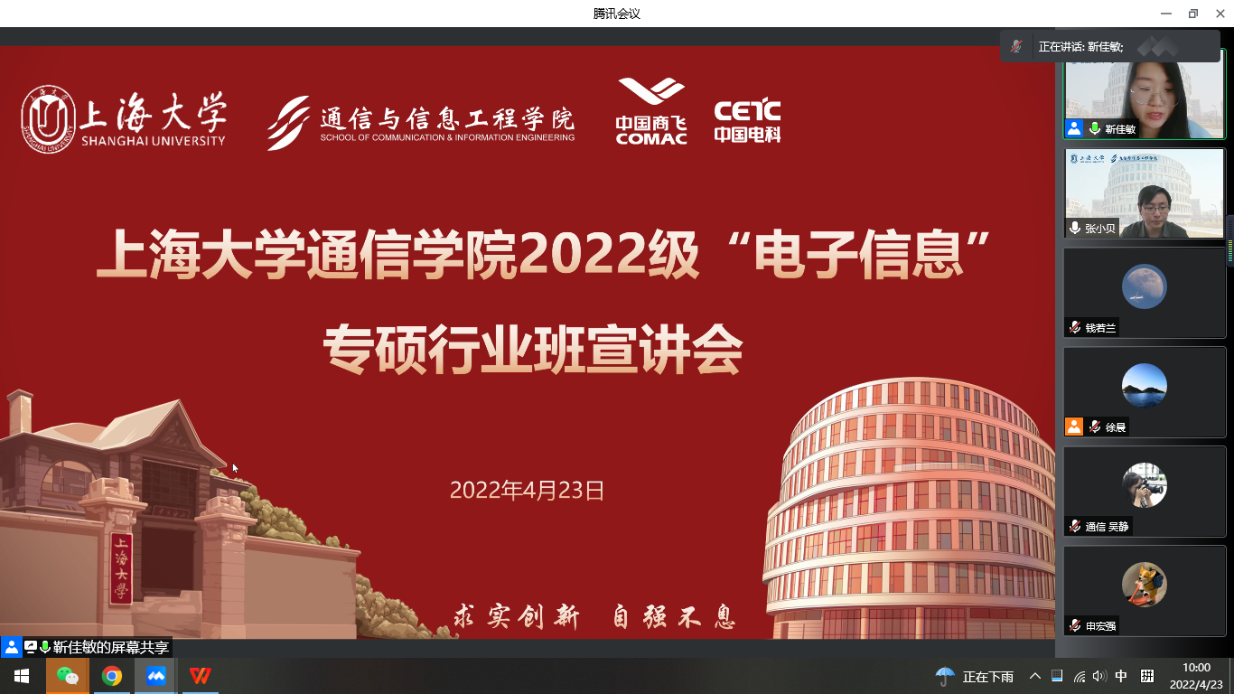 为服务信息技术领域国家重大战略需求,yl23411永利集团yl23411永利集团“电子信息”专业硕士采用行业方向培养和项目制培养相结合的培养方式,目前在建专硕行业班3个:高端民机设计人才班(简称“大飞机班”)、航天电子班(简称“航天班”)和电科光电班(简称“光电班”)。为使同学们更加了解专硕行业班的具体情况,并鼓励2022级专业硕士研究生踊跃报名,4月23日上午,公司通过腾讯会议举办了“yl23411永利集团yl23411永利集团2022级‘电子信息’专硕行业班宣讲会”。本次会议邀请了上飞院教育培训中心培训主管徐晨、上飞院电子集成部部长助理许健、中国电科23所人力资源副处长李晓玉、招聘主管范菁、魏玮为大家宣讲和答疑。公司党委副书记、副经理陈涛老师、公司副经理张小贝教授出席,会议由公司研究生辅导员靳佳敏主持,公司本科生辅导员及50余名2022级专硕研究生参加了本次宣讲会。