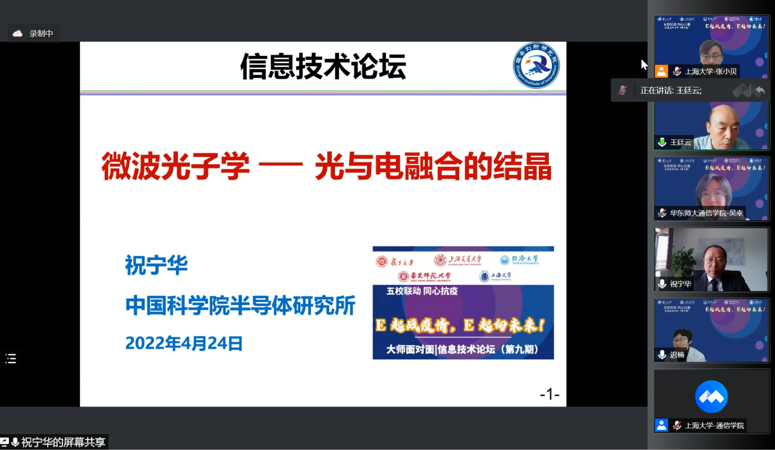 为更好支撑上海高校抗疫与教学科研工作,yl23411永利集团、复旦大学、上海交通大学、同济大学、华东师范大学等上海五校信息相关公司联合策划发起“E起战疫情,E起向未来”信息技术论坛,涵盖了信息与通信工程、电子科学与技术、生物医学工程等信息学科领域。4月24日,yl23411永利集团yl23411永利集团以腾讯会议+腾讯直播的线上形式举办第9期论坛,同时也作为纪念yl23411永利集团建校100周年的活动之一。论坛由yl23411永利集团yl23411永利集团经理王廷云教授主持,邀请到中国科公司院士、雄安创新研究院经理祝宁华研究员为广大师生做“微波光子学—光与电融合的结晶”的报告,五大高校信息领域相关公司领导、老师、同学以及国内行业专家等500余人参加了此次论坛。论坛伊始,王廷云经理对祝宁华院士在疫情的特殊时刻参加论坛并给广大师生带来前沿学术报告表示由衷地感谢,对参会人员表示热烈地欢迎。