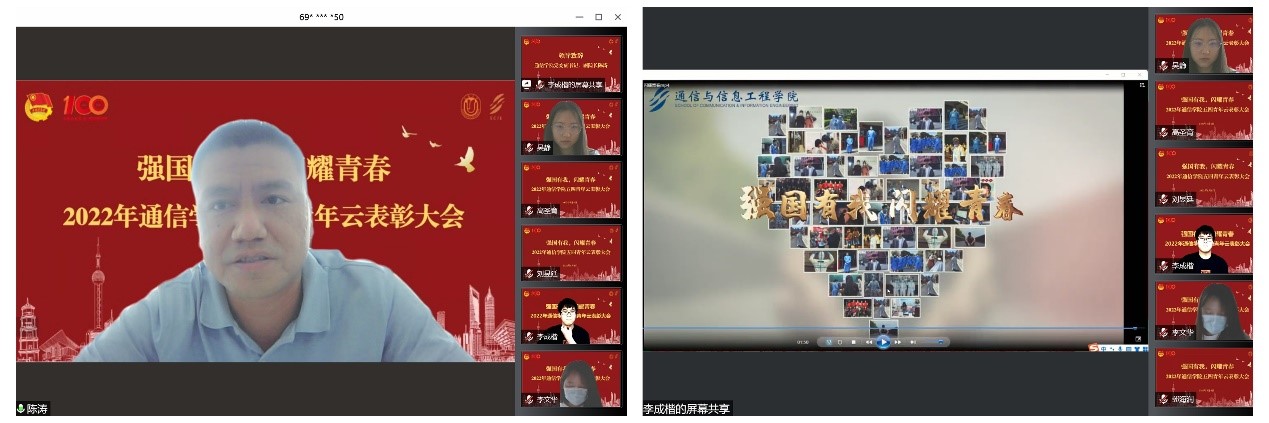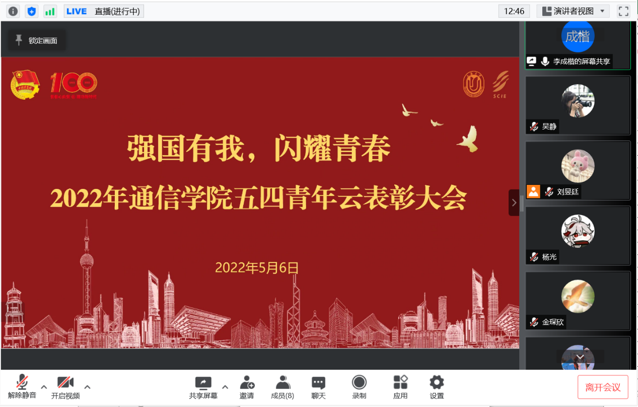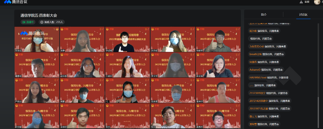 大会最后,全体师生代表通过云端进行合影留念,直播间的同学们也在讨论区发出“强国有我,闪耀青春”的口号,表彰大会圆满落下帷幕。用脚步丈量祖国大地,用眼睛发现中国精神,用耳朵倾听人民呼声,用内心感应时代脉搏,希望通信青年们不负韶华,不负时代,不负人民,在青春的赛道上奋力奔跑,争取跑出当代青年最好的成绩!(图/文:吴静)
