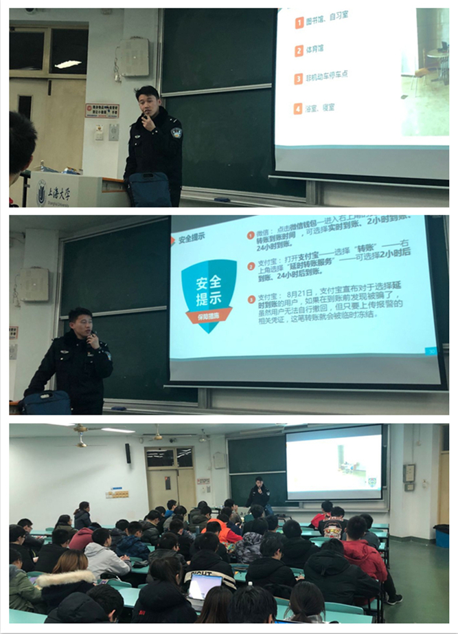 此外,陆警官特别讲到防范电信网络诈骗。作为一个新兴的诈骗“行业”,电信诈骗总是令人防不胜防。骗子冒充公检人员、假扮正规公司招工、假扮客服、伪装成熟人,甚至有退票改票业务,这些都能够成为电信诈骗罪犯手中捞金的利器,所以大家在生活中一定要提高警惕,谨防电信诈骗,发现及时拨打110、12345以及沪东高校派出所电话22027732。