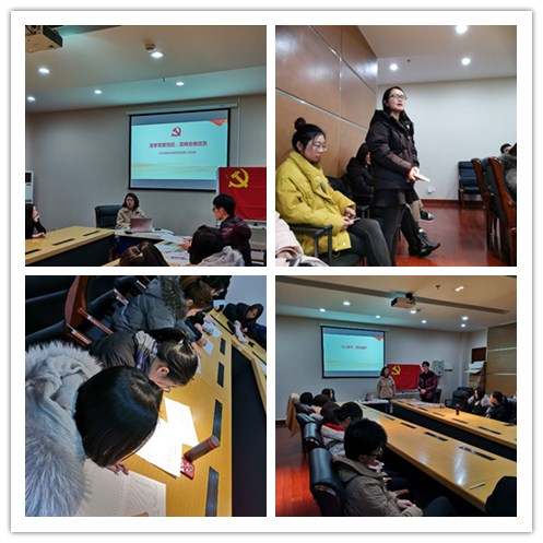 首先由支部书记何沁祝做主题报告。报告第一部分为关于十九大新党章党纪修改内容的学习。为适应新时代的发展形势,十九大新修条例共142条:整合2条,新增11条,修改65条。规定了八种新型典型违纪行为,把“坚持从严管党治党”作为党的建设的一项基本要求,把“全面从严治党永远在路上”写入党章。十九大修改党章是推进党和国家的事业发展的需要,是加强和改进党的建设的需要,是马克思主义中国化的理论创新的需要。学习新党章后,何沁祝又针对党员的基本义务、处罚条例和做合格党员等内容进行讲解。