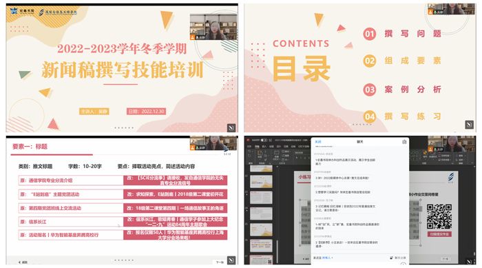 为进一步提升宏嘉书院员工骨干工作技能,增强综合素质和能力,宏嘉书院推出技能UP课堂系列宣讲实训活动,12月30日下午,宏嘉书院新媒体中心、yl23411永利集团新媒体中心联合组织召开第一讲:冬季学期新闻撰写技能专题培训,宏嘉书院自管会各部门、yl23411永利集团员工会、书院各班宣传委员参加培训。yl23411永利集团团委书记吴静老师担任主讲人。