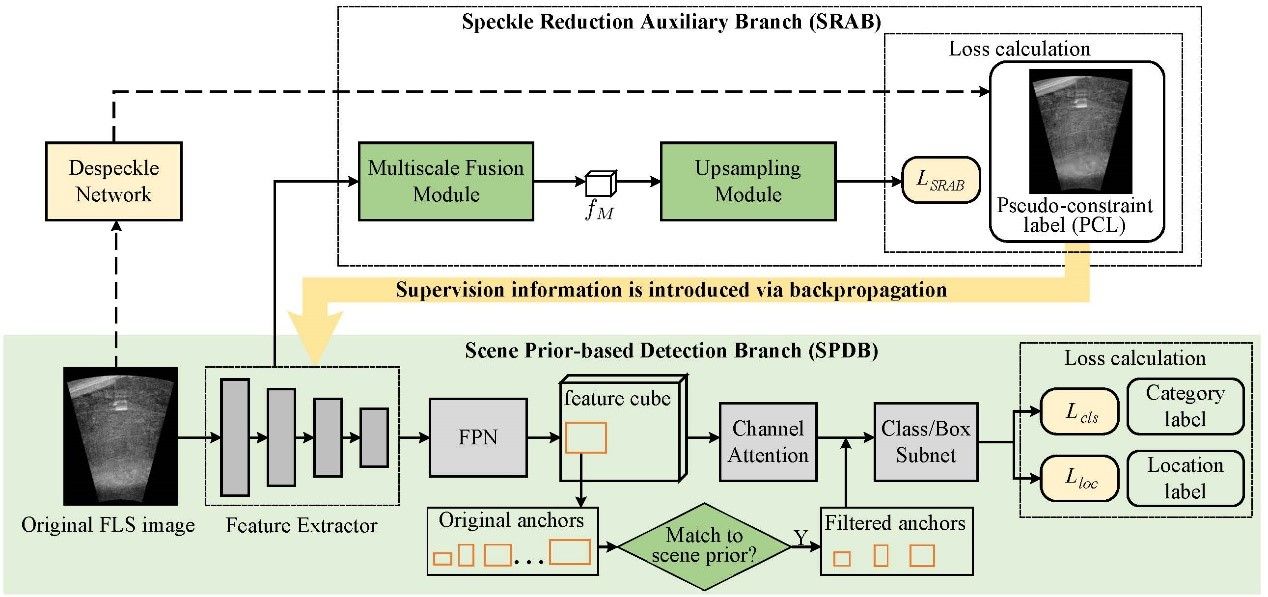 本文通过对水下前视声呐图像的斑点噪声抑制和场景先验的考虑,提出了一种新的检测网络。该工作将图像中的噪声特征描述为乘性伽马分布,引入了斑点抑制辅助分支消除不利于检测的干扰特征,还设计了特征选择策略筛选匹配目标尺寸的特征层来减少冗余框的产生。实验结果表明,本算法在mAP和mAR指标上均有5%-10%的提升,FPS指标上有10%的增益,优于许多最先进的通用探测器和声纳图像探测器。该技术为水下声呐图像的目标检测提供了新的解决思路,将有助于提高水下机器人探测、识别的精确度和灵敏度。