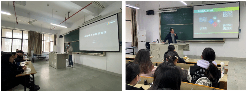 《项目管理》由来自盛趣信息技术的丁乙和华讯网络的陈海勇从软件开发和通信项目实施两个角度为大家讲解。丁乙老师以游戏软件研发为例,从需求管理、进度管理、成本管理、质量管理、沟通管理和敏捷开发这六个方面进行阐释。陈海勇老师结合案例,从售前阶段、实施阶段和维护阶段全面介绍了项目管理的内容,使同学们意识到了项目管理的重要性与必要性。
