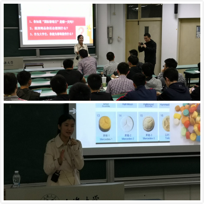 首先,吉老师对禁毒知识进行了提问,发现在座同学对禁毒知识还是知之甚少,于是接下来具体介绍毒品的分类、效果与成瘾性。她着重强调了新型毒品和易滥用药物的种类与危害、还介绍了毒品交易可能会出现的场所,告诫同学们在酒吧、宾馆、KTV等场所要提高防范意识。几段微视频直观展示了吸毒者造成的巨大社会危害以及吸毒给人体自身会造成的不可挽回的伤害,让大家唏嘘不已,感觉触目惊心。