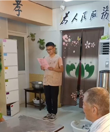 2023年6月17日上午9时,彤心学子走进雨花敬老院,换上雨花志愿者服装,在早会上,义工老师和同学们分享彼此来到雨花敬老的缘由,大家由爱老敬老的爱心牵引相聚在此,与老人们一齐度过温馨的一天。