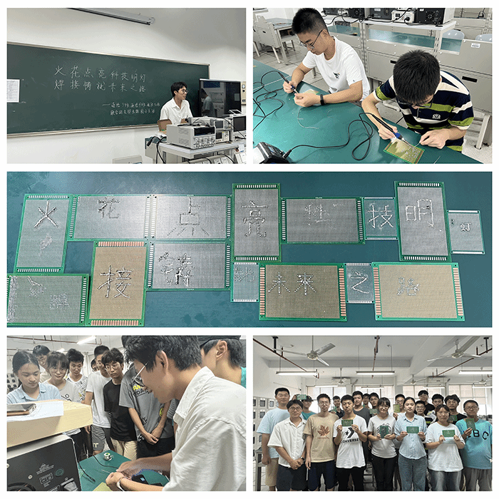 随着一块块电路板的完工,活动进入了尾声。同学们举起各自的焊接作品——凝聚着一个多小时辛勤汗水的成果,团聚在一起,这个大家满脸洋溢着自豪感和喜悦感的瞬间被照片定格,永远留存在我们每个人的成长之路中;电路板逐字摆放在一起,共同拼凑成“火花点亮科技明灯,焊接铸就未来之路”,这是我们合作完成的作品,也承载着大家共同的期望。