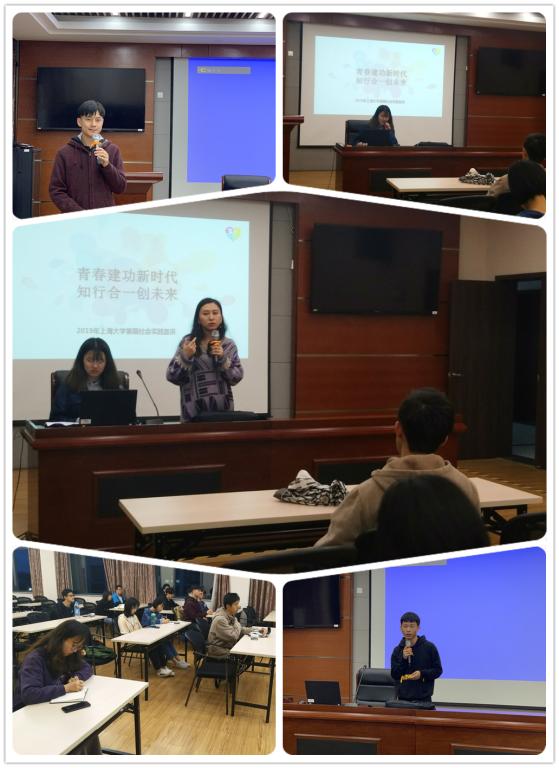 随后,陈砚颖老师对今年的四个选题方向做出了进一步的解读,从家乡历史、城市历史、校史回顾等参与选题一“红色传承,献礼华诞”、利用通信专业知识为支撑开展选题二“关注民生,学以致用”相关的社会实践、围绕环保主题,结合社会现状,积极发现其它环保问题进行选题三“绿水青山,扶智扶贫”的申报、从沿线城市出发,与其他公司合作就选题四“一带一路,走向世界”开展调研。