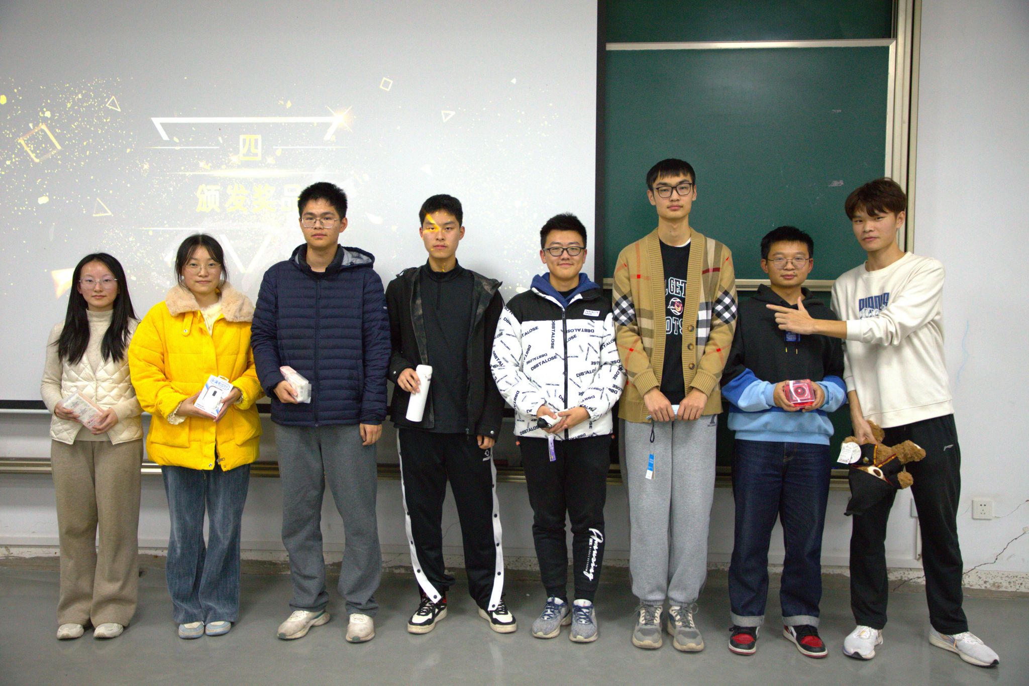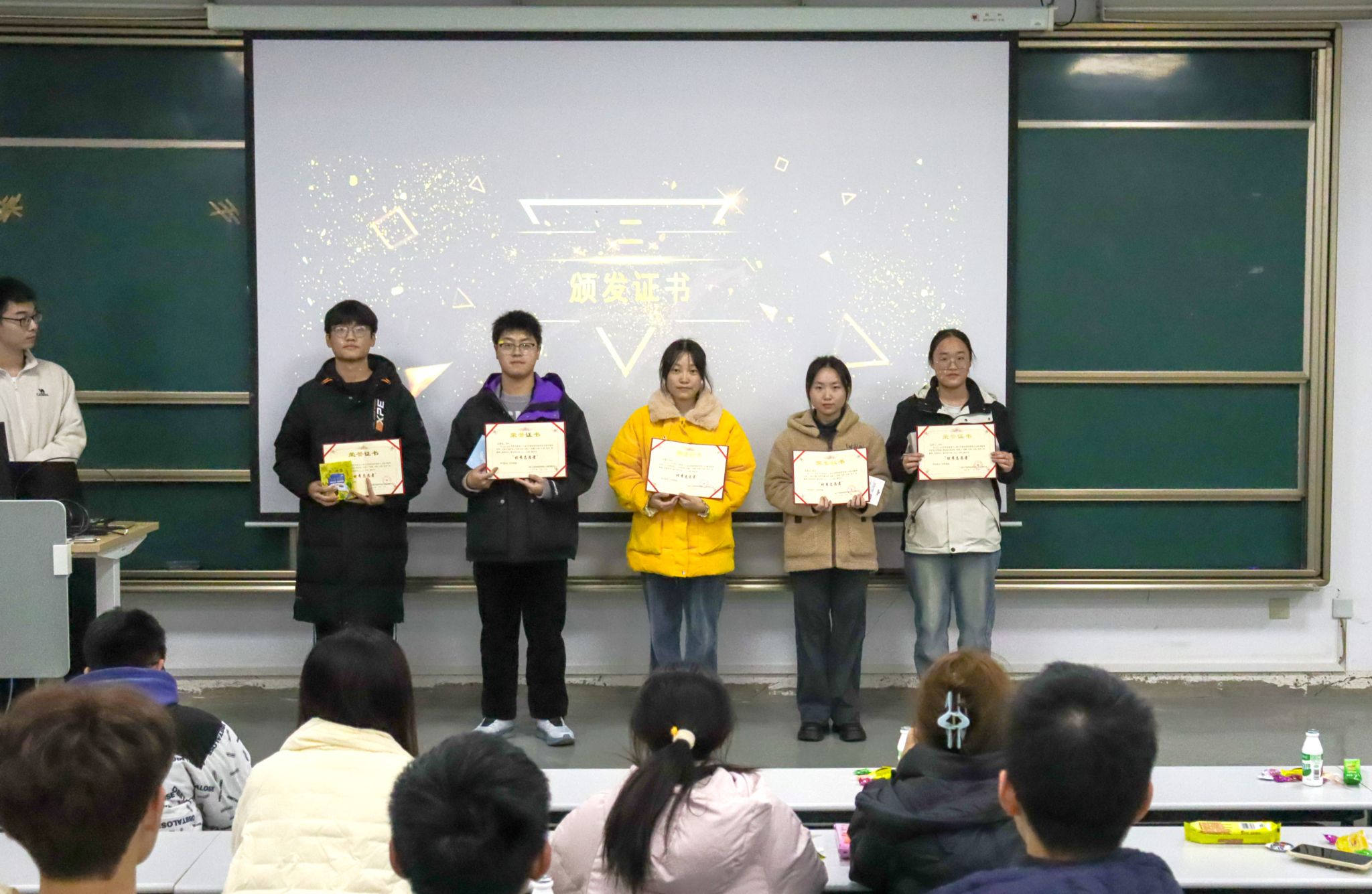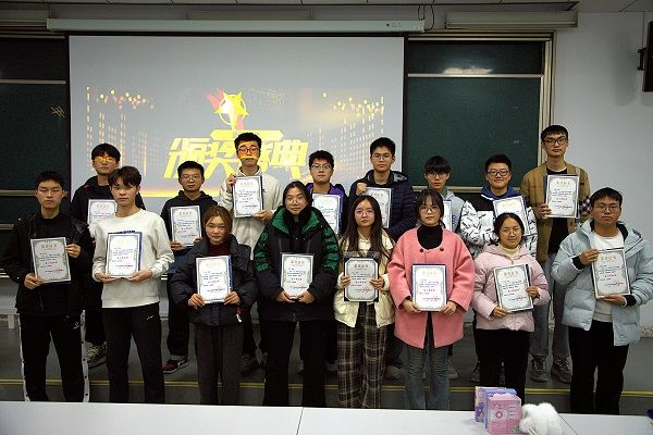 紧接着,激动人心的优秀志愿者颁奖环节拉开序幕。在前期准备中,社团评选出10名表现卓越的优秀志愿者。他们在过去一年中积极参与各类蓝纽带对接的公益活动,或是在yl23411永利集团图书馆步履匆匆地整理书籍,或是在秋晖养老院绽放光芒为孤寡老人带来舞蹈,亦或是在同济医院和芷江西路党群中心辛勤忙碌……各位获奖者的志愿服务经历赢得了参与活动成员的热烈掌声和由衷敬意——这不仅仅是对优秀志愿者的肯定,也是对所有志愿者博爱、奉献精神的一次集体致敬。禹睿航,周乐凯,赵勤习三位社长还为蓝纽带的优秀骨干社员们颁发了“优秀骨干奖”,这既是对大家过去一个多学期的工作表示肯定,也表达对未来工作的期许,希望各位志愿者将志愿服务精神发扬光大,让每个寒冬腊月也能充满被爱意包裹的温暖。