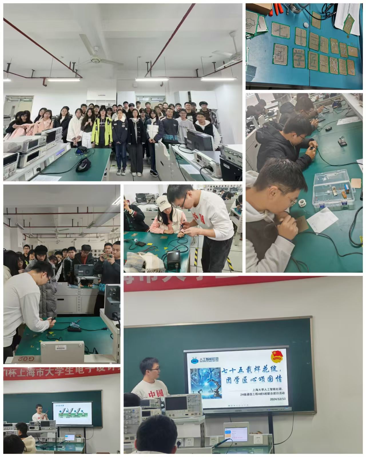 实践演示后,同学们迫不及待地亲手焊接电路板。在郭晨飞学长的细心指导与同学们的共同努力下,每一块电路板都凝聚着同学们的汗水与智慧,每一次焊接都见证着他们的成长与进步。
