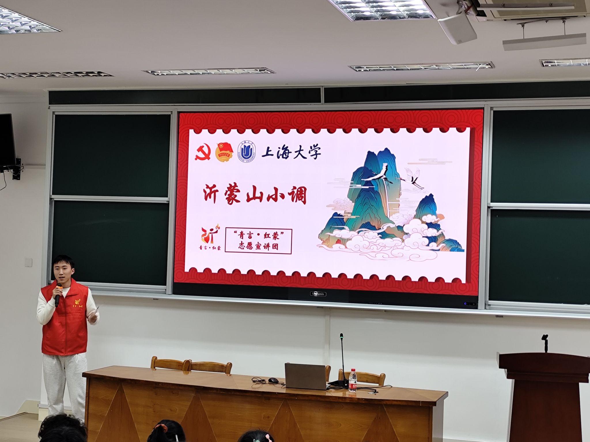 宣讲团成员张家豪以互动问答向同学们展示了沂蒙的美丽景色,带领大家领略沂蒙地区秀美的自然风光,接着讲述了《沂蒙山小调》的诞生地及创作背后的故事,通过播放《长津湖》中雷公牺牲时哼唱《沂蒙山小调》的悲壮片段,让同学们感受到了沂蒙精神在歌声中的代代相传与生生不息。