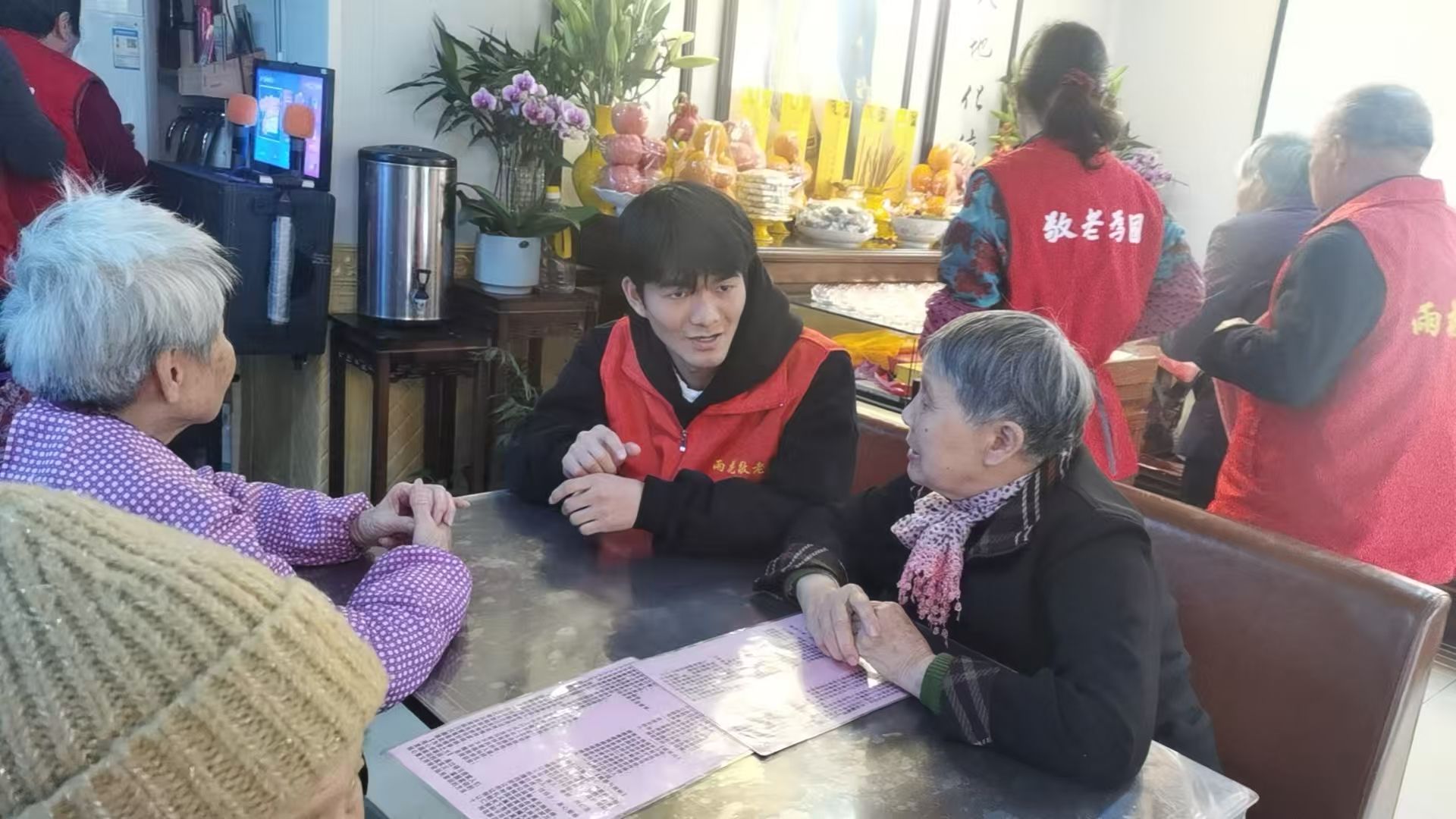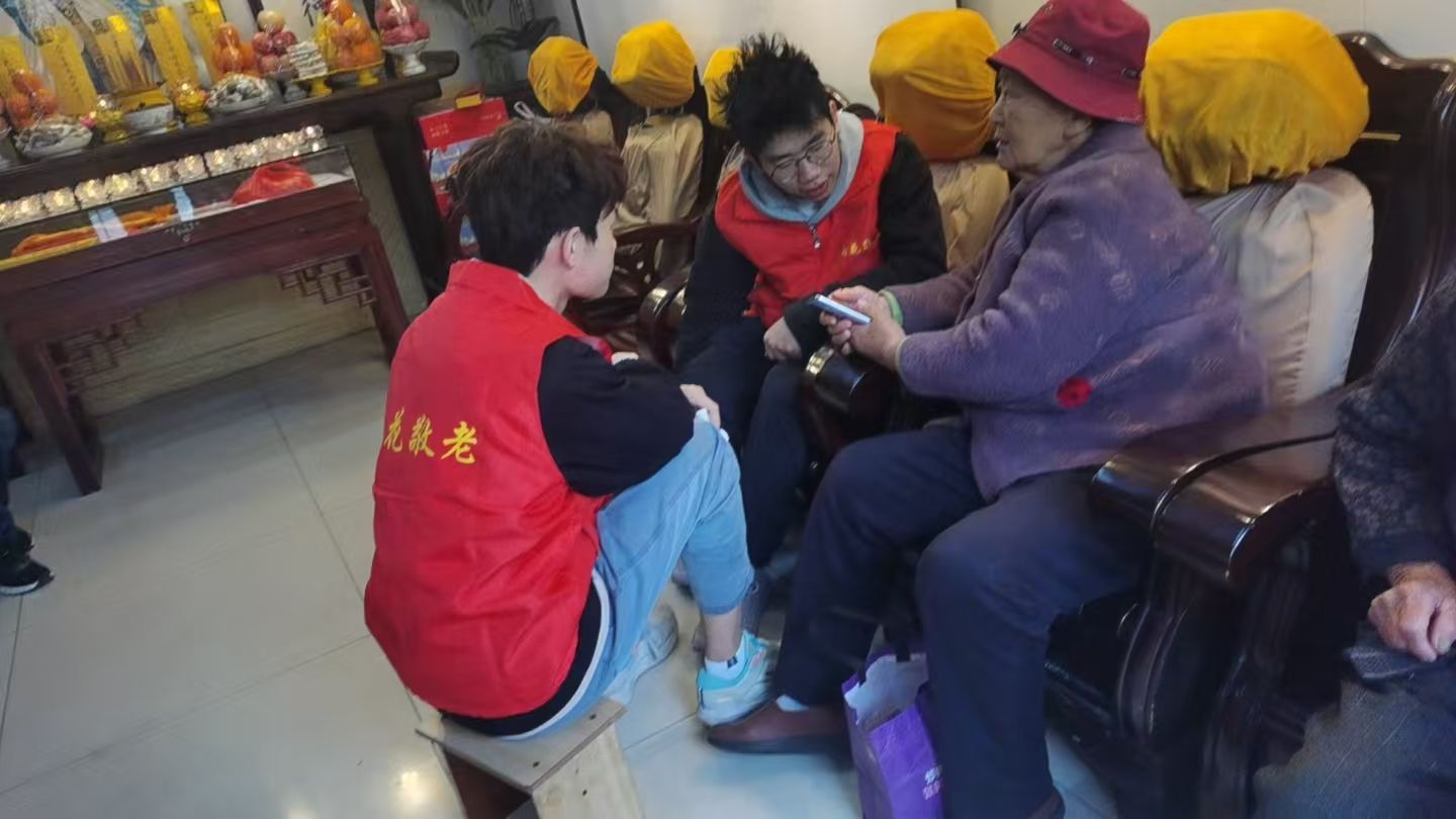 活动伊始,志愿者同学们缅怀先人,践行“孝为德本”的观念。之后大家围坐在老人身旁,倾听他们的人生故事。老人们在分享自己人生故事和智慧的同时也不忘关心志愿者同学们的学习和生活情况。23级通信六班的阮海凌同学特意为老人们带来了一场温馨的歌唱表演,他的歌声优美动人,吸引了在场每一位老人的注意,大家不禁随着音乐的节奏轻轻拍起了手,节拍的响声和欢笑声交织在一起,仿佛所有人都被这美好的瞬间深深感染。现场气氛十分融洽,充满朝气的笑声与银发笑脸交相辉映。