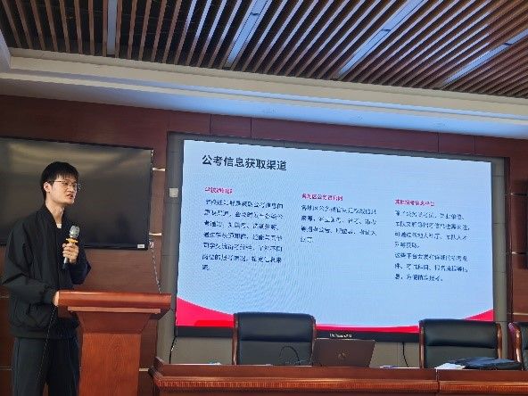 在经验分享环节,黄竞泽学长和贺建宇学长结合自身考公经历,从报考初心、时间管理、笔试技巧等三方面展开交流,强调信息搜集是考公成功的第一步,建议同学们通过多渠道了解招考政策。针对应届生关注的"学业+秋招+考公"多重压力,提出"提前完成科研任务、集中1-2月专攻笔试"的解决方案。在行测申论备考方面,重点剖析言语理解、数量关系等高分模块的答题技巧,提倡"真题实战+错题复盘"的科学训练法,现场展示的学习规划表引发热烈关注。