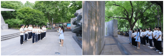 巍峨的五卅运动纪念碑矗立在广场中央,庄严肃穆,气势恢宏,师生党员们缓步上前,向纪念碑敬献鲜花,表达对革命先烈的深切缅怀和崇高敬意,也象征着红色基因在代代相传中生生不息。献花结束后,大家怀着崇敬心情在纪念碑前集体诵读碑文,一字一句,饱含深情,仿佛回到了那段烽火连天的岁月,重现了革命先辈们为了理想信念,前赴后继、英勇献身的壮烈场景。