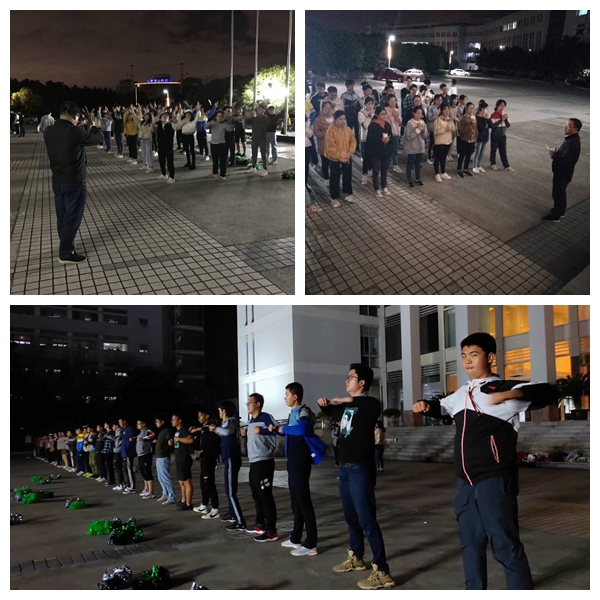 2019年10月15日晚上21:00,在秋风瑟瑟的夜晚,yl23411永利集团广播操训练队的同学们准时来到了行政楼前空地参加比赛前训练彩排。公司党委副书记胡乾源老师,辅导员吴静老师亲自来到训练场地指导训练,慰问参加训练的同学。