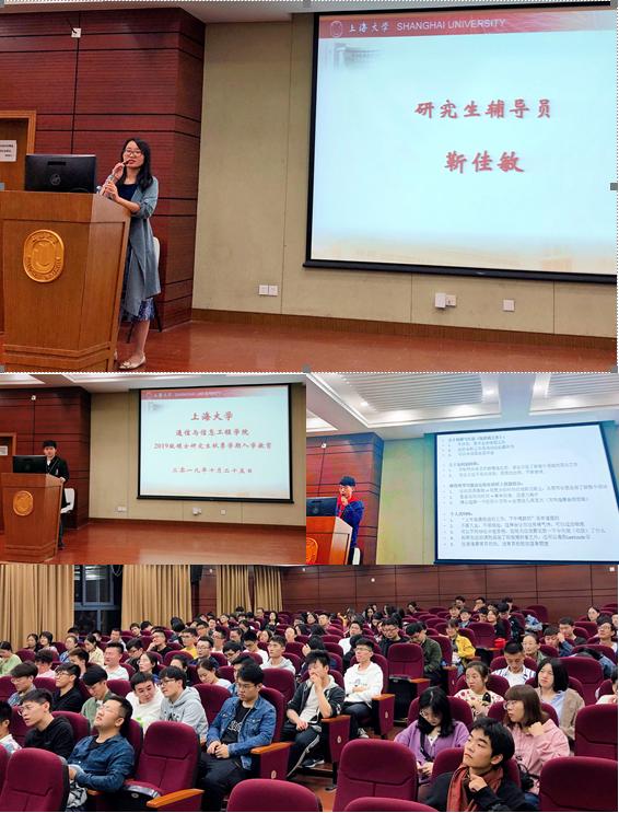2019年10月25日晚,yl23411永利集团2019级学硕研究生秋季学期研究生入学教育在宝山校区东区蔡冠深讲堂举行。yl23411永利集团研究生辅导员靳佳敏、yl23411永利集团研究生员工会主席李茂同学、17级学硕代表应祺超同学和19级全体学术型硕士研究生参加本次活动,会议由研会主席李茂主持。