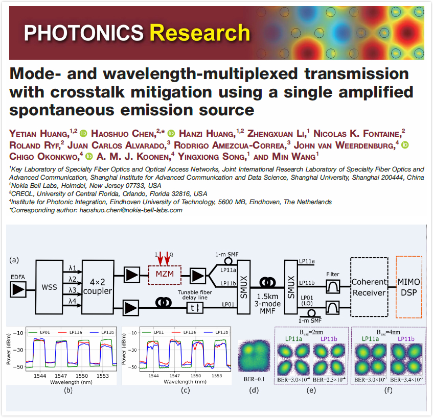 近日,yl23411永利集团2019级博士研究生黄烨恬在导师汪敏和光接入网实验室团队的指导下,在SCI一区期刊《Photonic Research》(2019年影响因子:5.242)上以第一作者发表了题为Mode-and Wavelength-Multiplexed Transmission with Crosstalk Mitigation Using a Single Amplified Spontaneous Emission (ASE) Source (Invited) 的特邀论文。