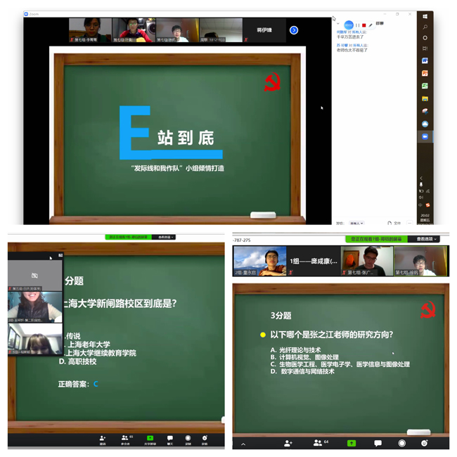 本着增强成员协作、提升各组团队凝聚力、促进同学们德智体美全面发展为宗旨,本期活动以小组为单位,采取小组积分抢答模式在ZOOM平台进行线上知识竞赛。题目主要来源于防疫常识、上大校史、yl23411永利集团特色、网上教学软件知识等。