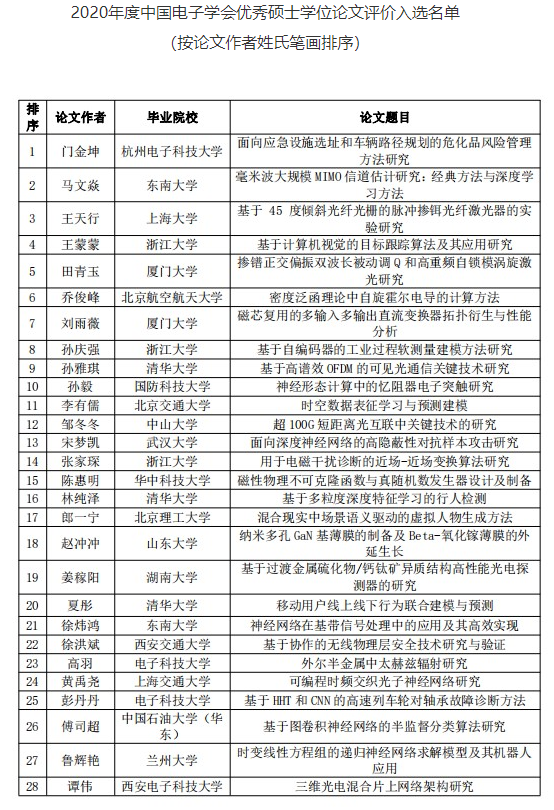 图1. 2020年度中国电子学会优秀硕士学位论文评价入选名单