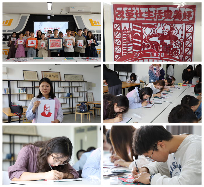 活动伊始,首先由社团成员简要介绍了剪纸的方法、注意事项,以及此次活动需要完成的大作品——《改革让生活更美好》,随后将材料分发给大家进行剪刻。除此之外,社团还准备了一些国家领导人、上大老董事长等名人头像和简单有趣的卡通剪纸图像供大家选择。在社团成员的帮助和指导下,老师和同学们顺利完成了自己的剪刻作品,大家互相展示成品,谈笑风生,活动现场气氛活跃。
