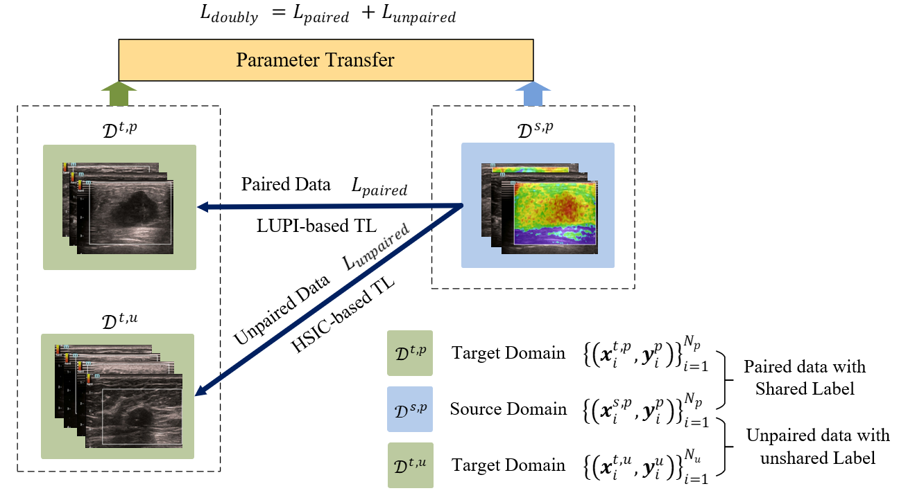 近日,yl23411永利集团2018级硕士生费晓燕在导师施俊教授指导下,其论文“Doubly Supervised Parameter Transfer Classifier for Diagnosis of Breast Cancer with Imbalanced Ultrasound Imaging Modalities”被模式识别领域国际期刊Pattern Recognition(中科院一区,TOP,IF:7.740)录用。针对模态不平衡的乳腺B型超声(B-mode Ultrasound,BUS)图像和超声弹性(Elastography Ultrasound,EUS)图像的迁移学习问题,该论文提出一种将SVM+(Support Vector Machine Plus)算法和希尔伯特-施密特独立准则(Hilbert-Schmidt Independence Criterion,HSIC)集成到一个统一框架下的双重监督参数迁移分类器(Novel Doubly Supervised Parameter Transfer Classifier,DSPTC)模型,同时实现共享标签的成对数据和不同标签的不成对数据之间的迁移学习。